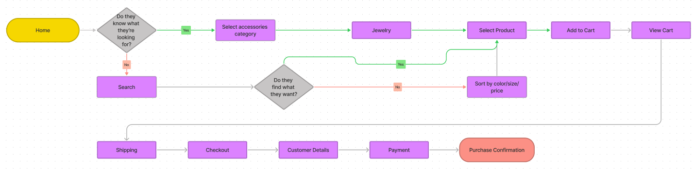 After identifying the main pain points and goals of the user, I created a user flow to show the step by step process of how they might navigate the site, addressing the needs of the user to provide a worthy solution to their problem: being able to quickly and easily locate items to purchase.