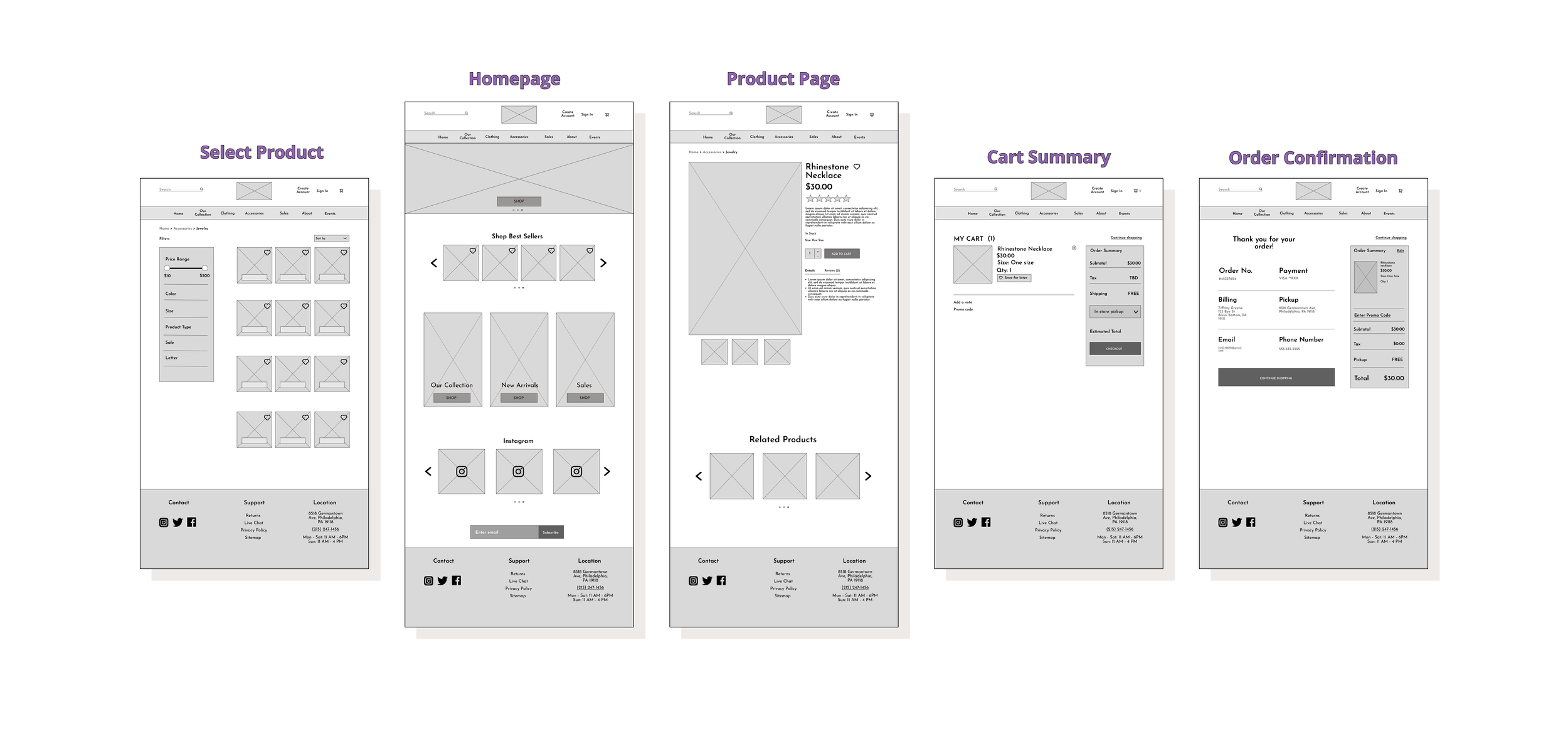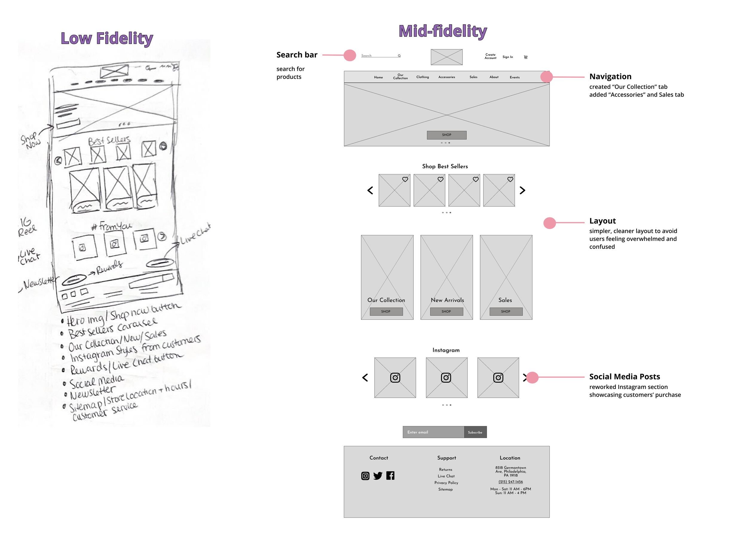 From my sketches, I created mid fidelity wireframes using Figma to more accurately define UI elements and showcase key features my proposed solution to providing an easy shopping experience.